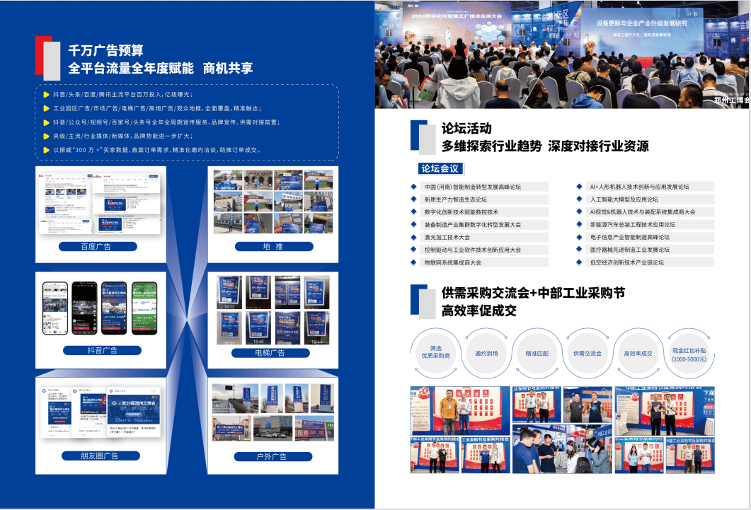 本届博览会气焰恢宏,仿若一片工业立异的星河,容纳下 3000 余家国表里的行业俊彦取领军企业。估计超 90,000 名专业不雅众将慕名而来,他们带着灵敏的行业洞察取合做期许,穿越于各个展位之间。展区规划更是精妙升级,九大从题展区并驾齐驱,从机床展、激光钣金展、工业从动化展,到机械人展、汽车配备展、新一代消息手艺取使用展、五金机电展、物流展、新材料展,全财产链条上的环节环节皆有呈现,为制制业的高质量成长注入磅礴动能。企业携宝,手艺争辉:一众行业头部品牌纷纷亮剑,亮出细心打磨的 “王牌” 产物,彰显雄厚的手艺底蕴。机床展区内,高精度的数控机床、智能化加工核心、细密车床划一排阵,金属切削工艺的极致逃求正在此展露无遗;工业从动化专区,伺服电机、变频器、PLC 等焦点设备协同运做,勾勒出将来工场高效运转的智能蓝图。精准邀约,买家盈门:展会靶向发力,深挖行业使用场景取用户刚需,专业不雅众邀约工做做到丝丝入扣。汽车整车、零部件制制,国防军工、轨道交通、农业机械、起沉机械等多元范畴的买家集群接连不断,供需精准对接,让参展商得以敏捷敲开潜力市场的大门,拓展合做邦畿。思惟盛宴,共探前沿:超 30 场专业论坛取行业峰会沉磅登场,诸如中国 (河南) 智能制制转型成长高峰论坛、新质出产力智制生态论坛等。学界泰斗、业界权势巨子、龙头掌舵人齐聚一堂,高谈阔论制制业新趋向,分享前沿洞察,参会者仿若置身学问取灵感的富矿,收成取合做契机。