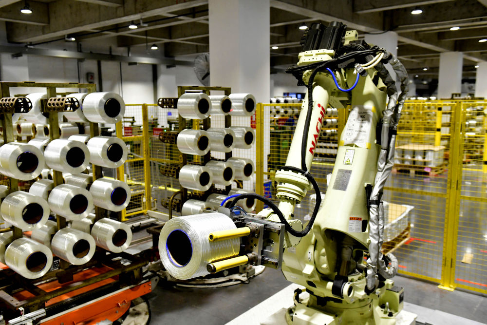 2025年3月18日,正在位于泰安市的泰山玻璃纤维无限公司,工业机械人正在搬运玻璃纤维产物。记者 郭绪雷 摄。