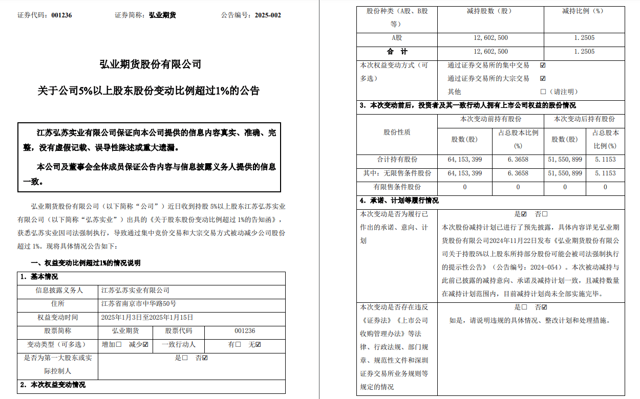 金鸿控股集团股份无限公司(金鸿控股)近日收到省沙河市出具的(2024)冀0582平易近初1103号《平易近事》、市高级出具的(2024)京平易近终1212号《平易近事》和(2024)京74平易近初60号之二《平易近事裁定书》;金融法院出具的(2024)京74平易近初59号之二号《平易近事裁定书》。案件二:因公司债券买卖胶葛,承平洋证券股份无限公司向金融法院对本公司及子公司湖南神州界牌瓷业无限公司、衡阳国能置业无限公司、中油金鸿华东投资办理无限公司提告状讼,公司于2024年4月27日披露了《关于公司严沉诉讼的通知布告》(通知布告编号为2024-026),公司于2024年8月16日披露了《关于公司严沉诉讼的通知布告》(通知布告编号为2024-057),现将相关诉讼进展环境通知布告如下:本次诉讼涉及两个案件,别离是因本公司刊行的15金鸿债取16中油金鸿MTNO01未能如期脚额偿付本息,形成违约。承平洋证券股份无限公司做为债务人代表对公司和公司的方提告状讼。受理法院均为金融法院。被告别离就上述两个案件提出管辖申请,于2024年5月27日金融法院对管辖开庭审理,公司于8月收到金融法院关于上述两个案件的平易近事裁定书,裁定驳回被告承平洋证券的告状。承平洋证券不服一审裁定,提起上诉,市高级于近日裁定驳回上诉。后,金鸿控股集团股份无限公司、湖南神州界牌瓷业无限公司、衡阳国能置业无限公司、中油金鸿华东投资办理无限公司于2024年12月31日向金融法院申请解除上述保全办法。因为承平洋证券的告状已被生效裁判驳回,2025年1月10日金融法院做出解除保全的裁定。来历:弘业期货股份无限公司关于公司5%以上股东股份变更比例跨越1%的通知布告(通知布告编号:2025-002)弘业期货股份无限公司(弘业期货)近日收到持股5%以上股东江苏弘苏实业无限公司(弘苏实业)出具的《关于股东股份变更比例跨越1%的奉告函》,获悉弘苏实业因司法强制施行,导致通过集中竞价买卖和大买卖体例被动削减公司股份跨越1%。